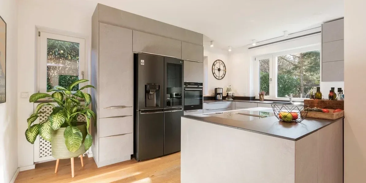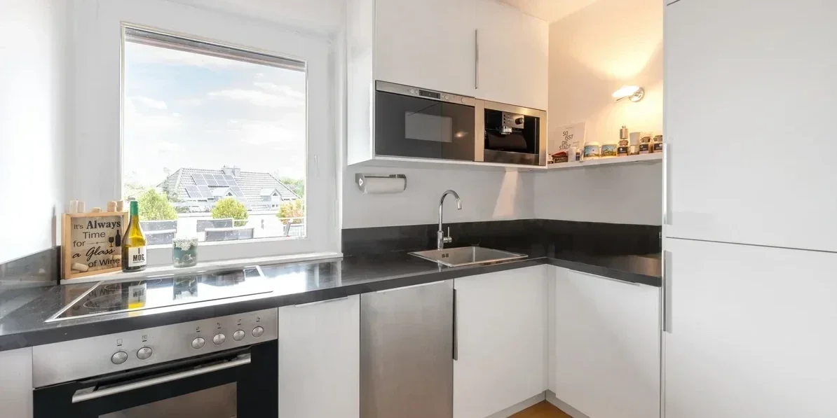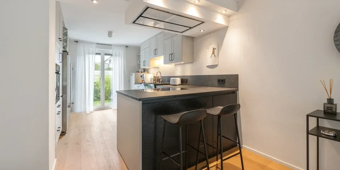 Eichenparkett mit Fußbodenheizung, elektrische Rollläden, eine moderne Einbauküche und ein cleanes, hochwertiges Baddesign schaffen ein sehr ansprechendes Wohnumfeld.