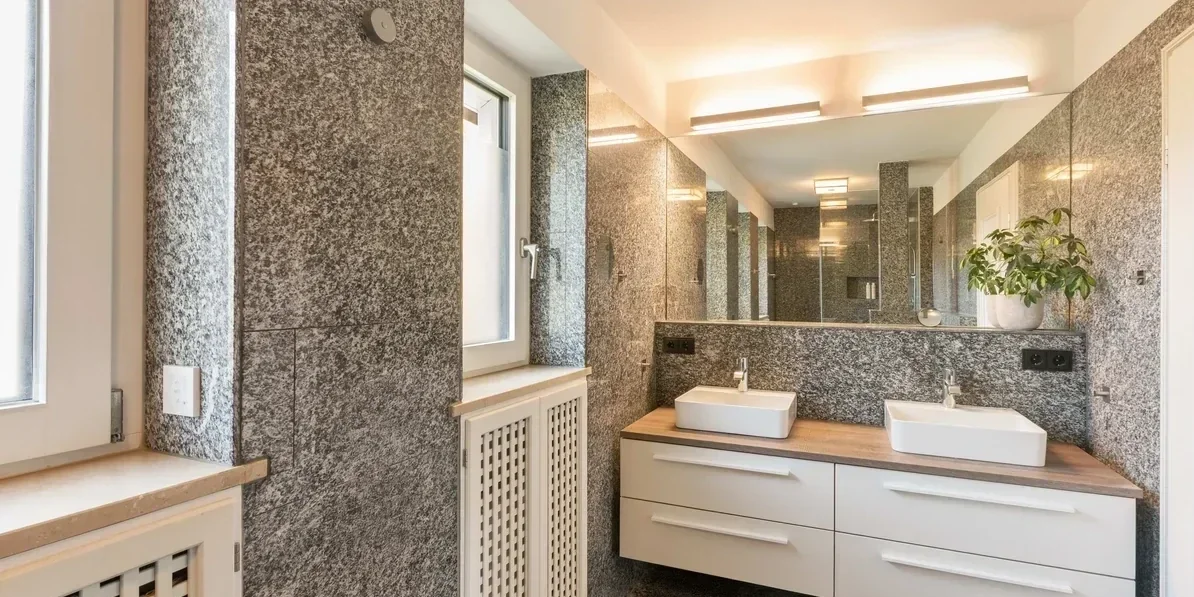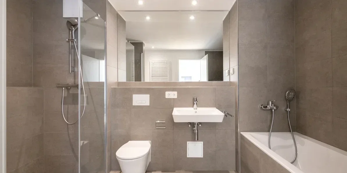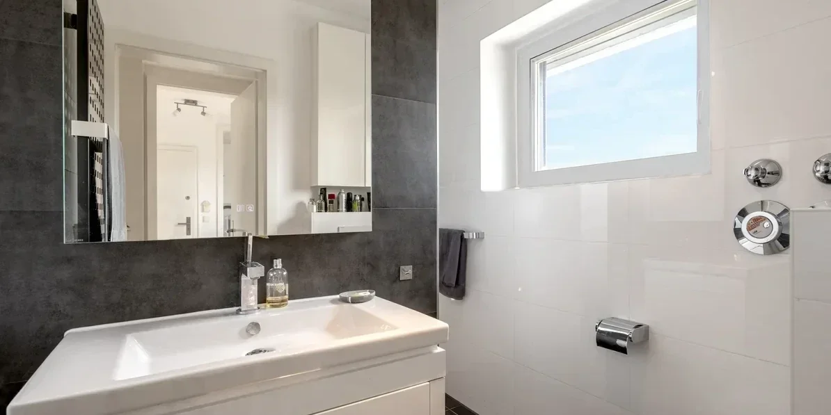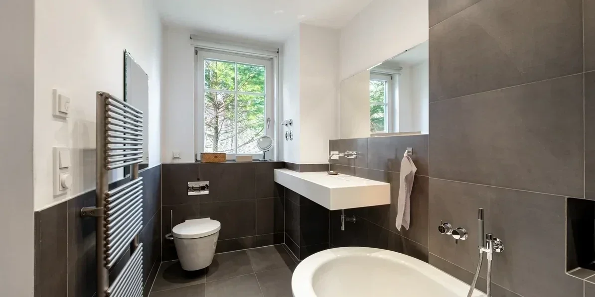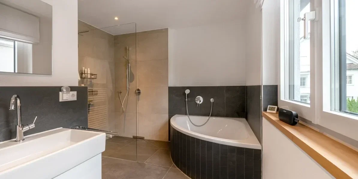 • geflieste Böden im Bad und hochwertiger Dekorfussbodenbelag in den Wohnräumen
