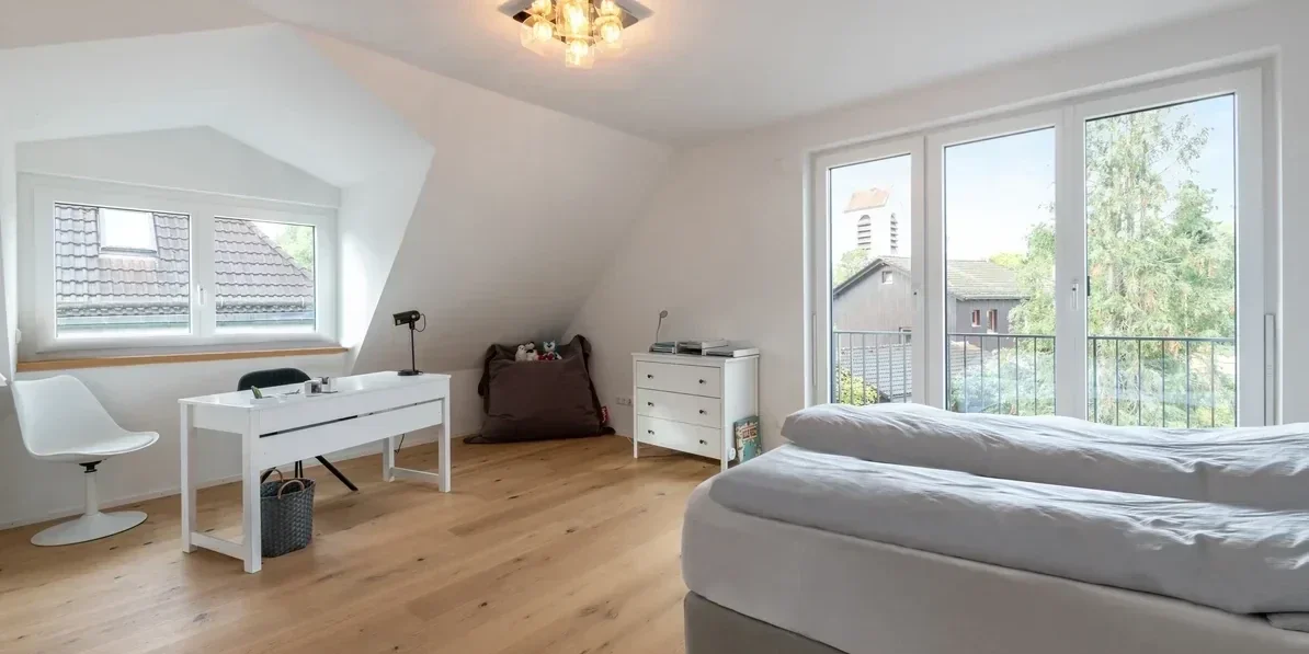 Die Wohnfläche erstreckt sich über ca. 241 m². Auf drei Wohnebenen verteilen sich ein weitläufiger, offener Wohn-/Essbereich mit offener Küche, ein Master-Bereich mit Schlafzimmer, Ankleide und Bad, drei weitere individuell nutzbare Zimmer, zwei weitere Bäder und ein Gäste-WC. Im ausgebauten Dachspitz lässt sich eine gemütliche Lese- oder TV-Lounge einrichten. Auch ein WC ist hier vorhanden. Im Souterrain kommen ein tagheller, wohnlicher Hobbyraum, ein Duschbad sowie Hauswirtschafts- und Abstellflächen hinzu. Balkone auf allen Wohnebenen und eine Terrasse mit Garten erweitern das Wohnen angenehm nach draußen. Komplettiert wird das Objekt durch eine Einzelgarage mit Wallbox und einen Außenstellplatz. Geheizt wird mit Gasheizung mit Solarthermie.